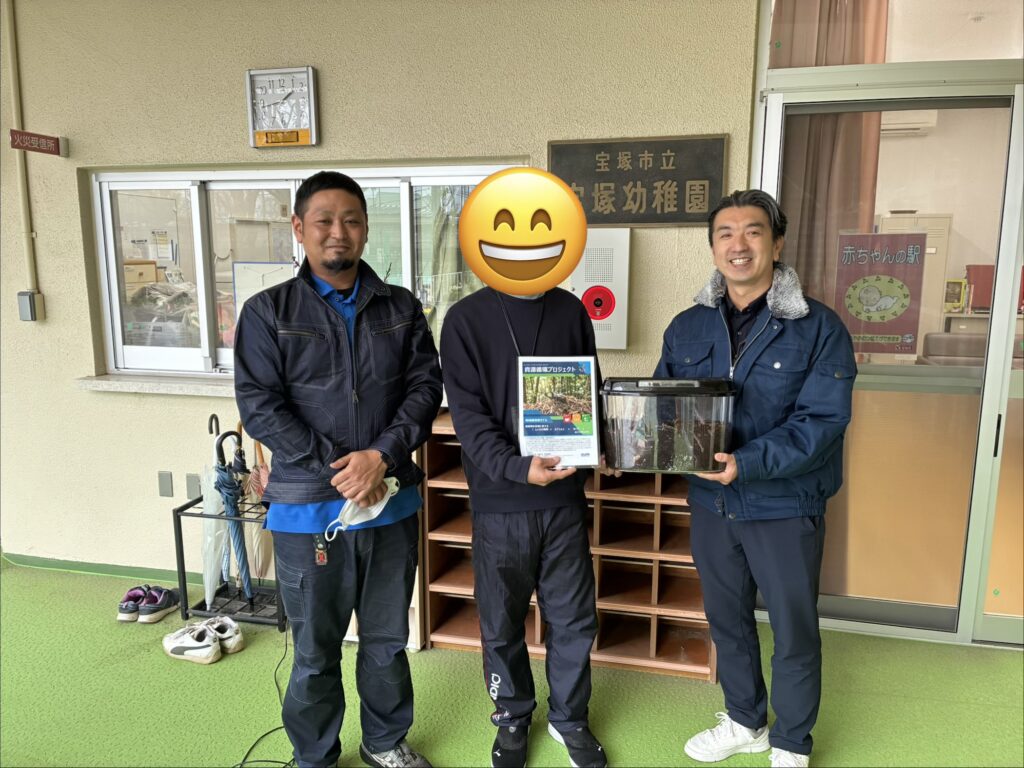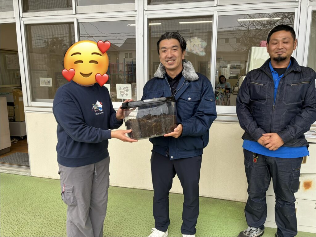 しいたけを栽培する際に使われる菌を植え付けられた「ほだ木」は、廃棄物として処理されておりますが、その「廃ほだ木」はしいたけ農家から大量に発生し、処理コストや環境負荷の問題となっております。一方、カブトムシの幼虫にとって、しいたけの「廃菌」は理想的なエサとなるそうです。そこで本プロジェクトでは、IZUMIの資源循環事業で取り扱う廃棄物「木くず」を破砕し製造される木質チップを活用し、当社宝塚エコ農園にカブトムシのふわふわのベッドを整備、さらにカブトムシのエサとなるしいたけの「廃菌」を活かし、自然にカブトムシが生息し、さらに産卵させることに成功しました。そこで生まれたカブトムシの幼虫が、「廃菌」をエサとして食べることで生育が進みます。そのカブトムシの幼虫は環境教育プログラムの一環として地域の子どもたちに寄付しています。さらに、カブトムシの糞は肥料として再利用し、資源循環を実現します。